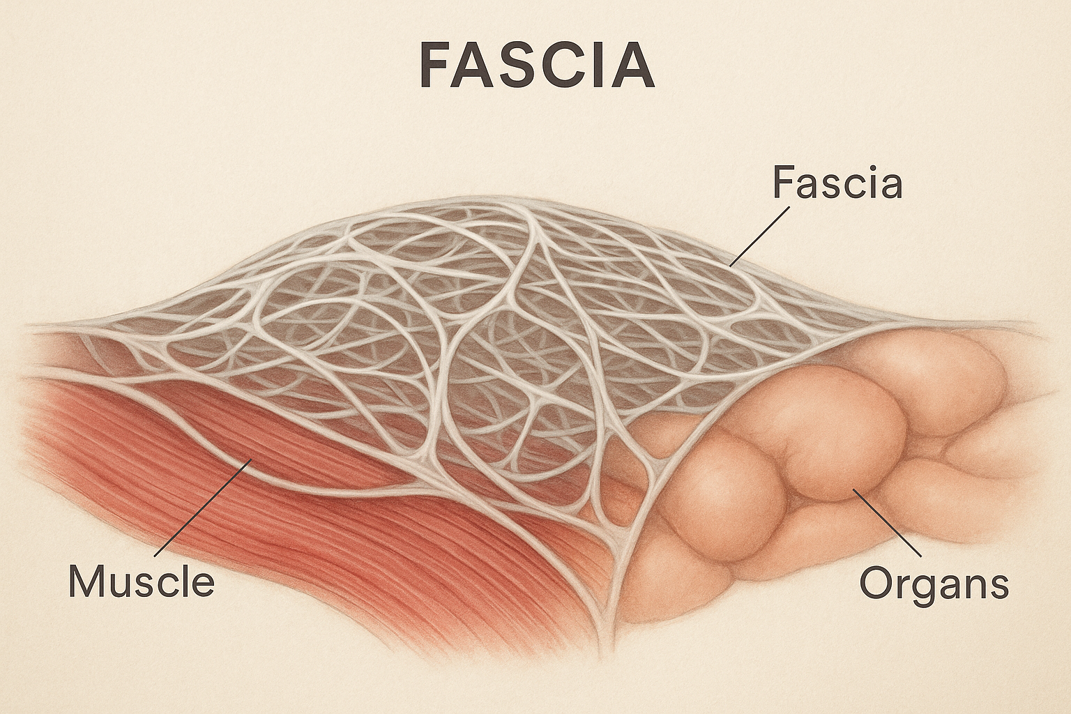 Fascia is a continuous web of connective tissue that wraps around every muscle, bone, nerve, and organ in your body—like a supportive 3D net. It provides structure, transmits mechanical forces, and even houses sensory nerves that inform the brain about body position (proprioception).